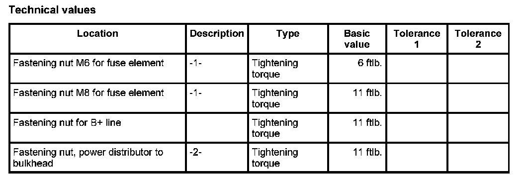 1. Position the fuse elements -3- in the power distributor in accordance with the wiring diagram and position the marked connection leads in turn, fit the washer -2- and tighten with the fastening nuts -1-. Tightening torque: 6 ftlb. Tightening torque: 11 ftlb.