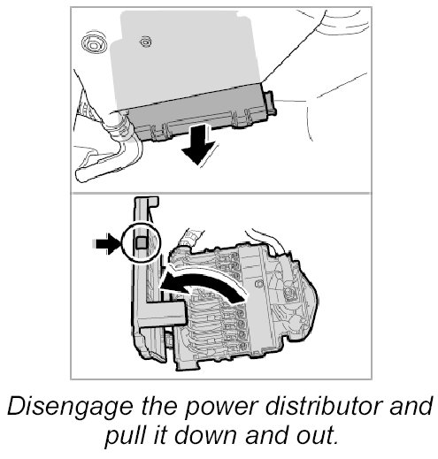 5. Pull the power distributor away from the firewall and lower it down into the passenger's footwell.