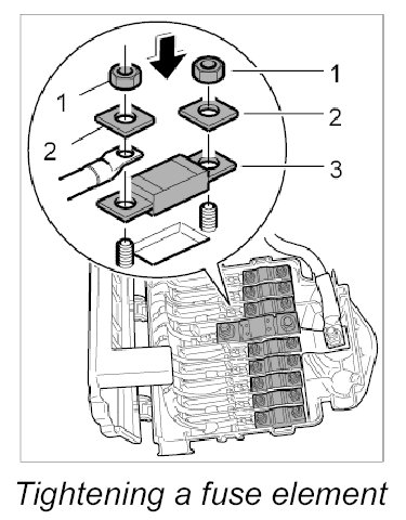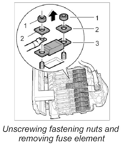 9. Unscrew the fastening nuts -1-, remove the washer -2- and take out the fuse element -3-.