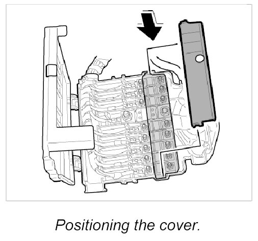 6. Slide the power distributor upwards between the heater/air-conditioning unit and the bulkhead, and engage in the bulkhead.