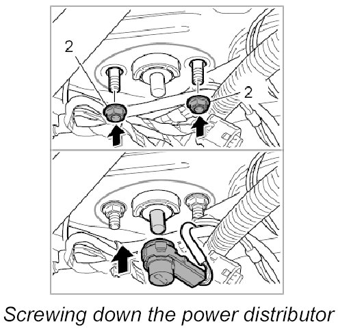 7. Screw down power distributor with the two fastening screws -2-. Tightening torque: 11 ftlb.