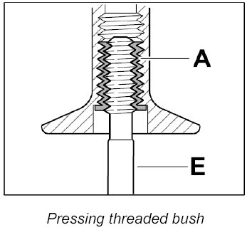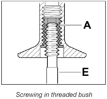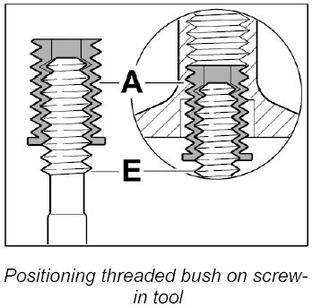 Screw threaded bush A in fully (note bush length classification) using the screw-in tool E.