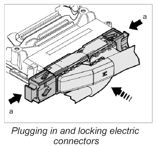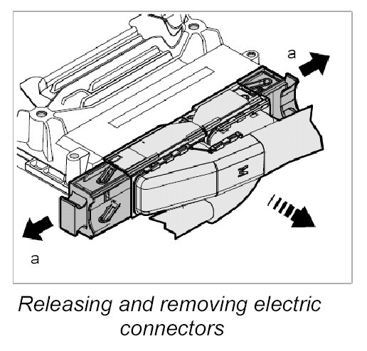 6. Release the two electric connectors -a- and pull them off the DFI control unit.