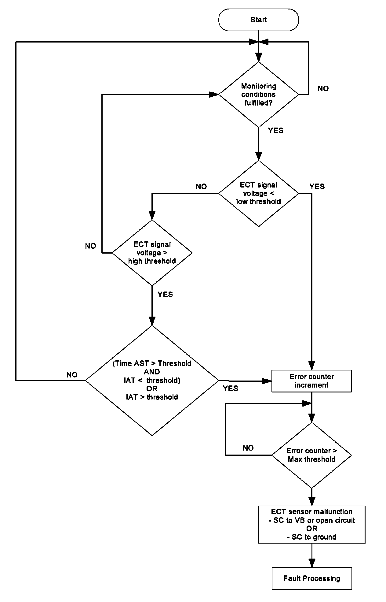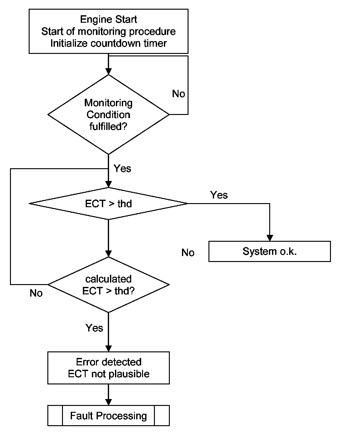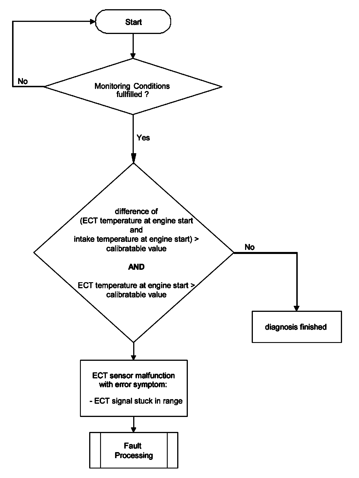 This coolant temperature plausibility diagnosis is performed once per engine run. At low ambient temperature a stuck open thermostat can cause an insufficient engine warm up. In the case that the coolant temperature is lower than the start temperature for coolant thermostat diagnosis a coolant temperature plausibility error will be detected.