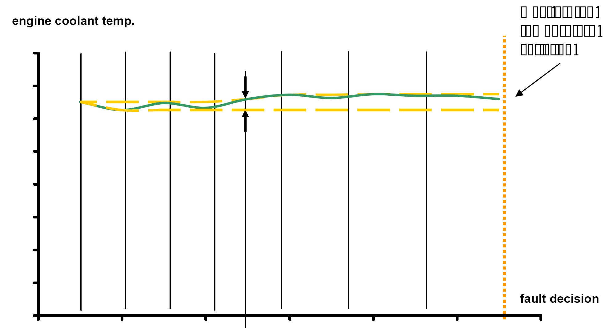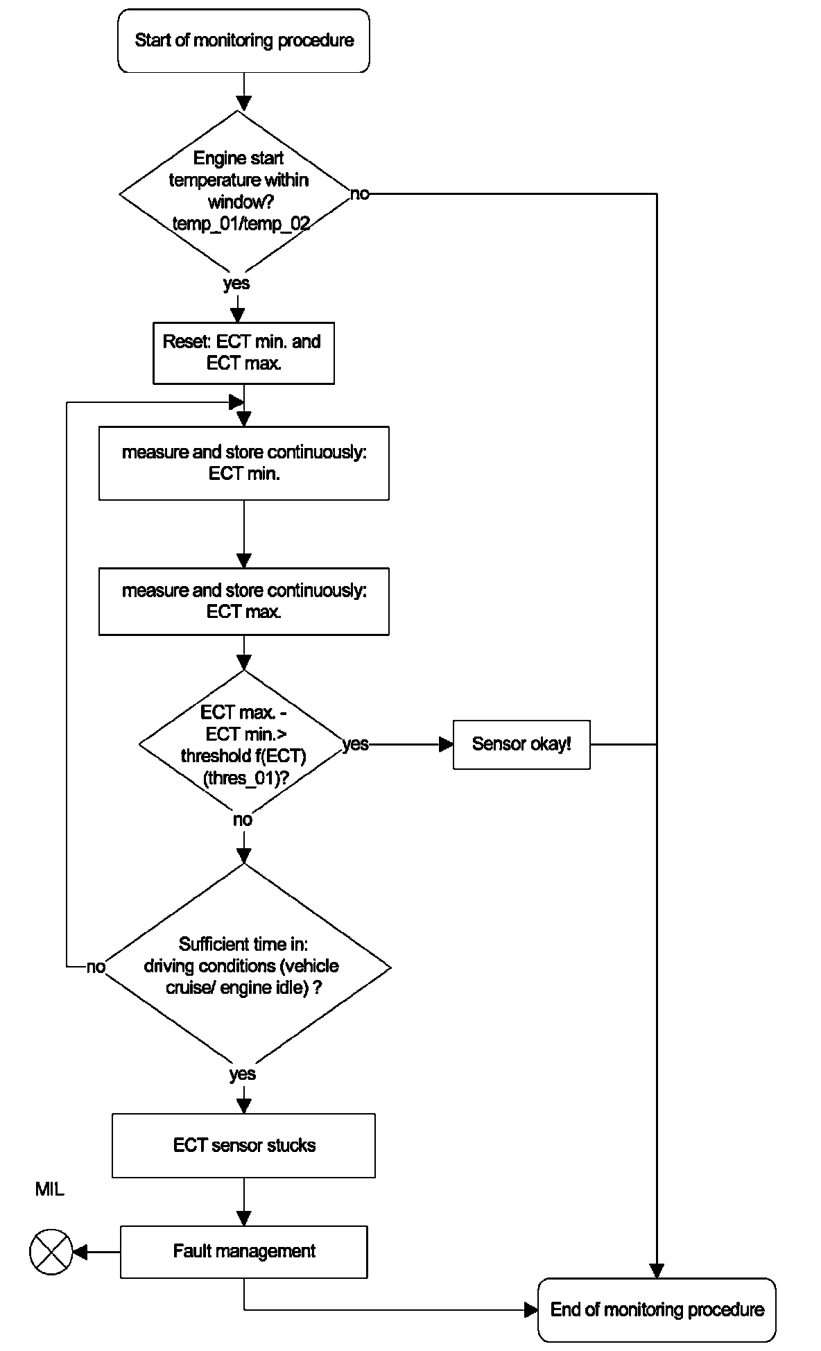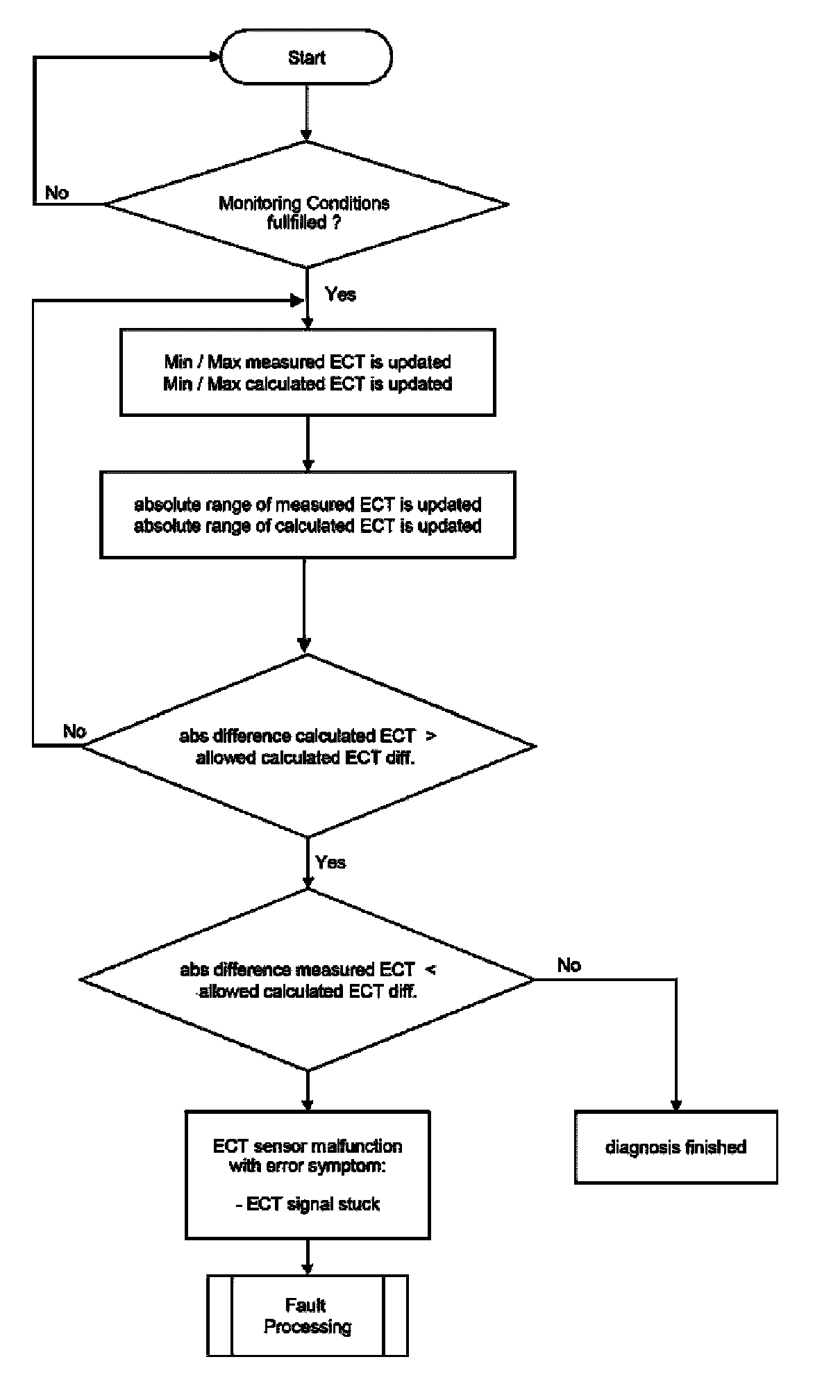 After engine start the system stores continuously the lowest and highest ECT. In case that after several driving conditions the difference between ECT max and ECT min is lower than the threshold the sensor stuck at high values.