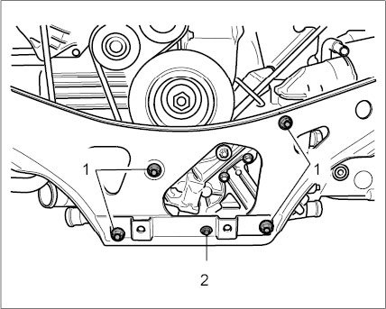 3. Remove engine carrier. Unscrew four M10 collar nuts -1- and one M6 x 20 Torx screw -2-.