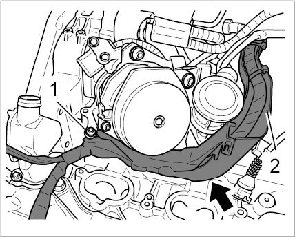 24. Disconnect the wire harness on the center of the engine (connections at starter) -arrow- and unclip at the heat exchanger -1-.
