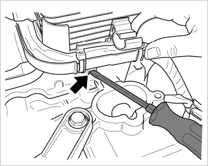 57. Unscrew 13 M6 x 20 Torx screws on the oil pan cover. Tap cover gently on the sides using a plastic hammer, then carefully lift it at the leverage bar -see figure- using a plastic-coated mounting lever and remove the oil pan.