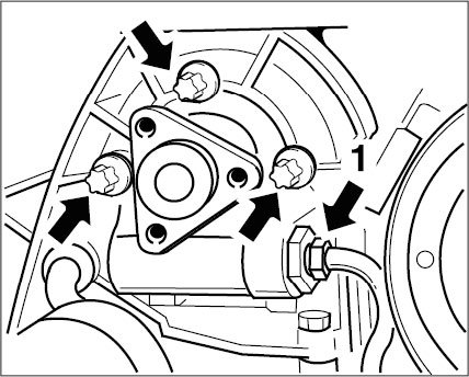 27.2. Unscrew four Torx screws (three M8 x 30 at the front -arrows-, one M8 x 12 at the back).