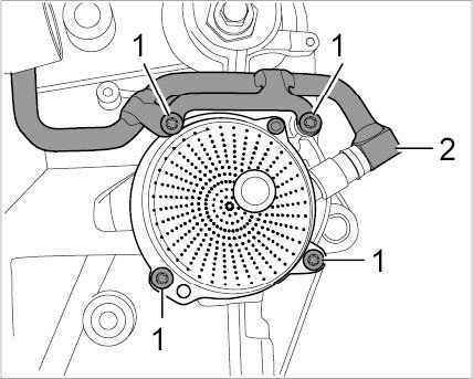 29. Remove canister for additional volumes of positive crankcase ventilation at cylinder head 4-6. Unscrew two M6 x 25 Torx screws and remove canister.