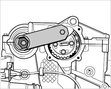 43. The central screws of the camshaft controller must be loosened before removing the cylinder head covers. To do this, place special tool retaining tool 9685 on the large hexagon of the central screw and cylinder head cover and loosen the screws.