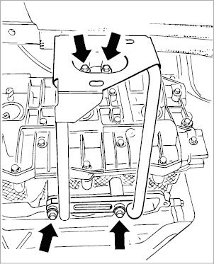 2. Cylinder side 4-6 only: Remove holder for rear silencer. Unscrew two M8 x 30 Torx screws on the intake side and two M8 x 25 screws on the exhaust side and remove the holder.