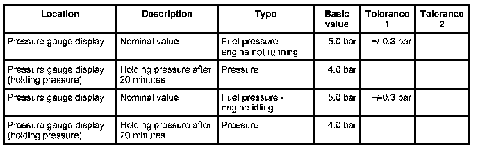 - Fuel pressure - engine not running: 5.0 bar ±0.3 bar