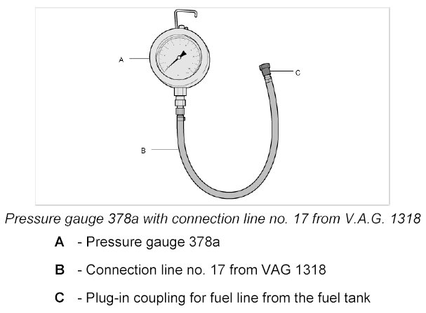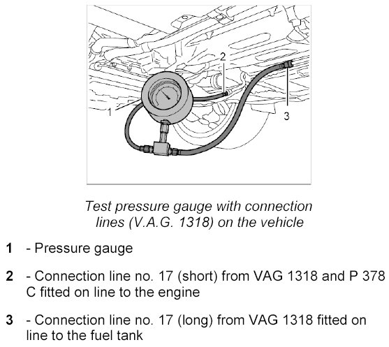 3. Connect special tool test pressure gauge with lines from K-Jetronic Tester V.A.G. 1318 WE 1291 to the fuel line.