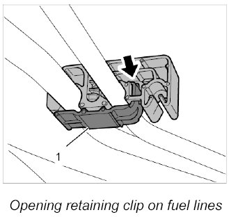 1. Open the retaining clip for the fuel lines on the underbody and unclip the supply line.