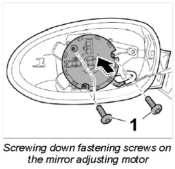 2. Unscrew the three fastening screws -1- from mirror adjusting motor.
