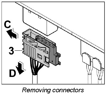 2. Move the slide on the electric connector in direction of arrow -C- and pull off connector -3- in direction -D-