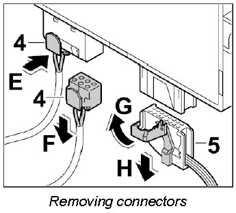 3. Press the two connectors -4- together -E- and pull them off the control unit -F-. Fold locking lever -G- over and pull connector -5- off the control unit -H-.