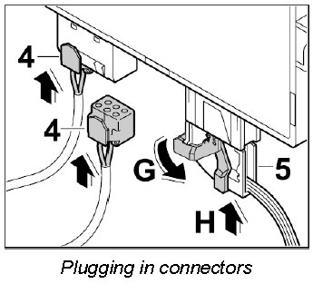 1. Plug in connector -5- and fold locking lever over -G- until it engages. Plug in the two connectors -4- until they engage securely.