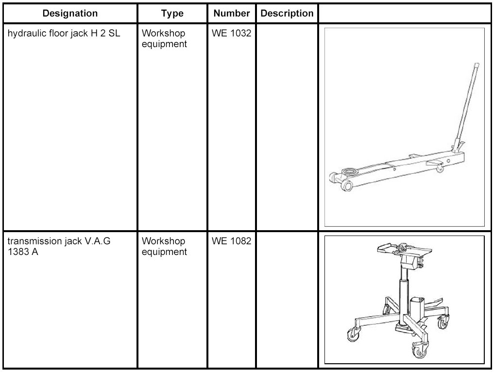 4. Support engine using hydraulic floor jack H 2 SL WE 1032 and transmission jack plate of transmission jack V.A.G 1383 A WE 1082 at the oil pan.