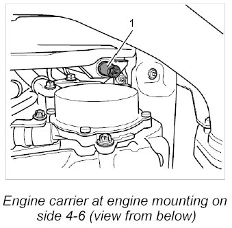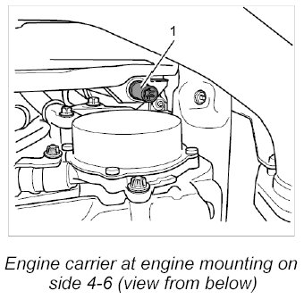 4.1. Loosen two M12 special nuts (inner Torx, screw insert T55) -1- at the engine mounting (hydraulic mount) on the left and right just until the engine can be lowered by around 15 mm.
