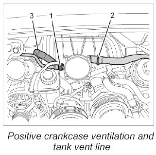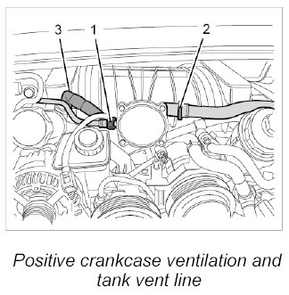 1. Detach positive crankcase ventilation lines -2 and 3- and tank vent connection -1- from resonance tube.