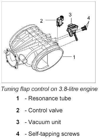 1.1. On the 3.8-litre engine connect a vacuum line and a cable plug onto the control valve of the tuning flap.