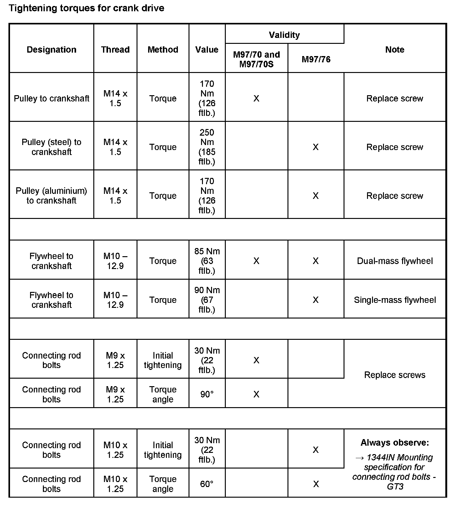 WM 1348TW Tightening torques for engine - crank drive, pistons