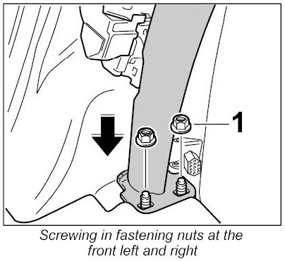 3. Screw in fastening nuts at the front left and right -1- ( -arrows- ). Tightening torque: 23 Nm (17 ftlb.) ± 2 Nm ( ± 1.5 ftlb.)