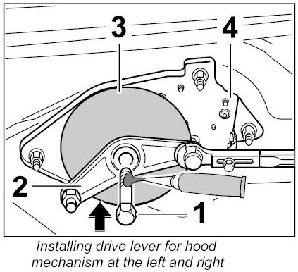 5.1. Unscrew fastening screw -1- and remove drive lever -2- and cover -3- from the hood mechanism -4- ( -arrow- ).