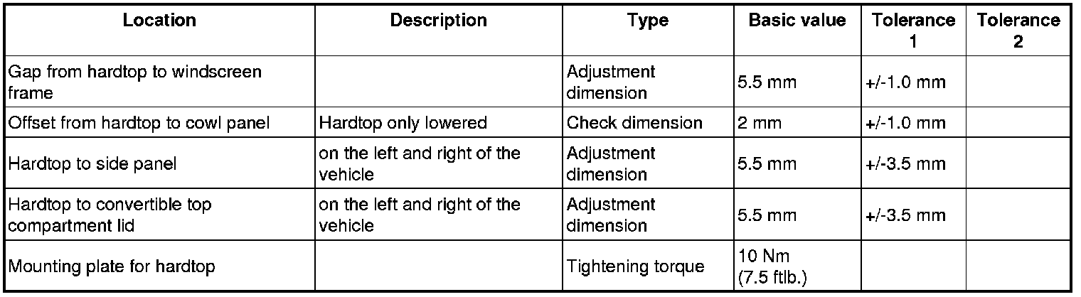 6.1. Adjust gap -Dimension D and C- by shifting the hardtop on both sides of the vehicle. => Adjustment dimension: 5.5 mm+/-3.5 mm => Adjustment dimension: 5.5 mm+/-3.5 mm