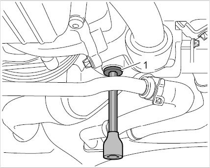 3. Unscrew the coolant drain plug (internal Torx a/f 8) M14 x 1.5 -1- at the coolant regulator housing.