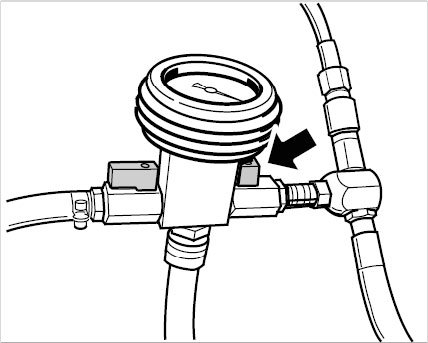 11. Open the left shut-off valve on the vacuum pressure gauge (right valve closed -arrow-).