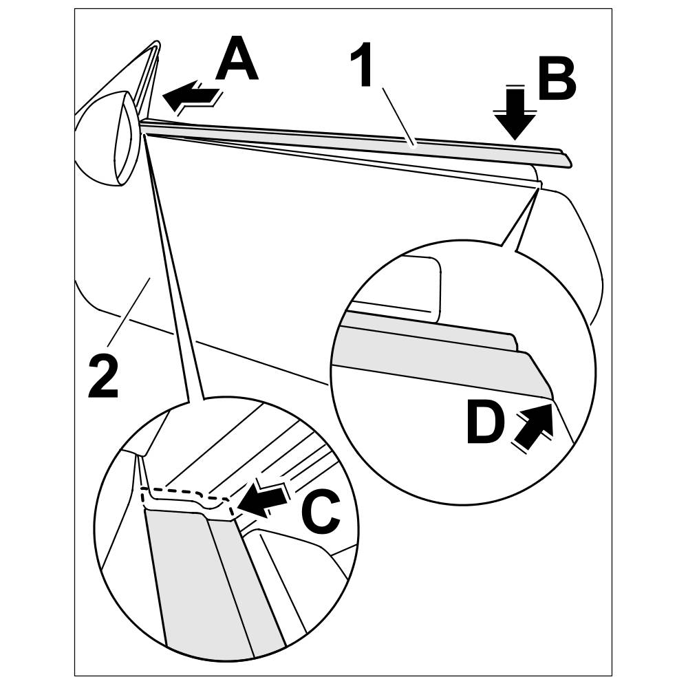 2. Pull front window bay seal -1- - beginning at the rear end -Arrow A- - off the sheetmetal door flange -2- in an upward direction -Arrow B-.