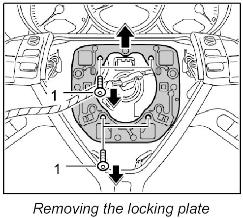 1. Unscrew the four fastening screws -1- from the locking plate in the steering wheel and remove along with the locking plate.
