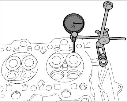 2. Check valve tilt play on intake valve. Adjust the dial gauge to the relevant angle of the valve to be checked and set to '0' with preload. Press valve disc towards dial gauge and pull it back again. Read off value and note it.