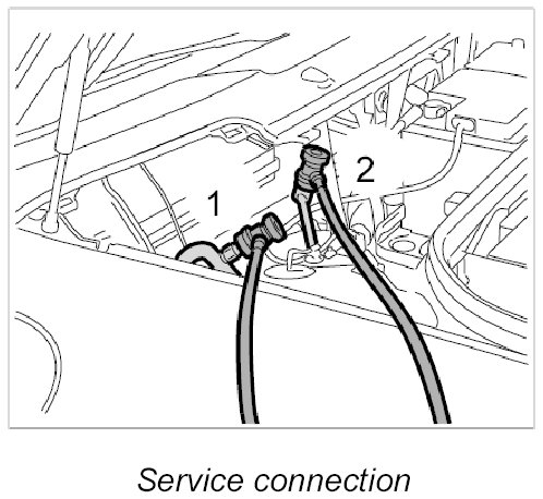 Before connecting the high-pressure -2- and low-pressure lines -1- to the vehicle, remove any refrigerant in the lines by suction.