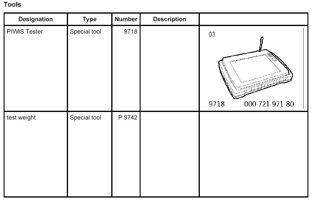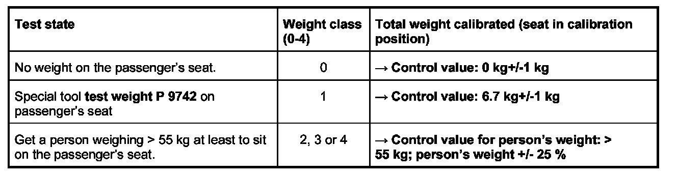 11.1.2. Place the special tool test weight P 9742 on the passenger's seat. The Passenger Airbag Off indicator light in the centre console must come on. Compare values (see table below) using the PIWIS Tester.