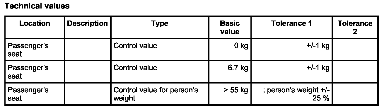 11.1.1. If there is no weight on the passenger's seat, compare values (see table below) using the PIWIS Tester. The Passenger Airbag Off indicator light in the centre console must not come on.