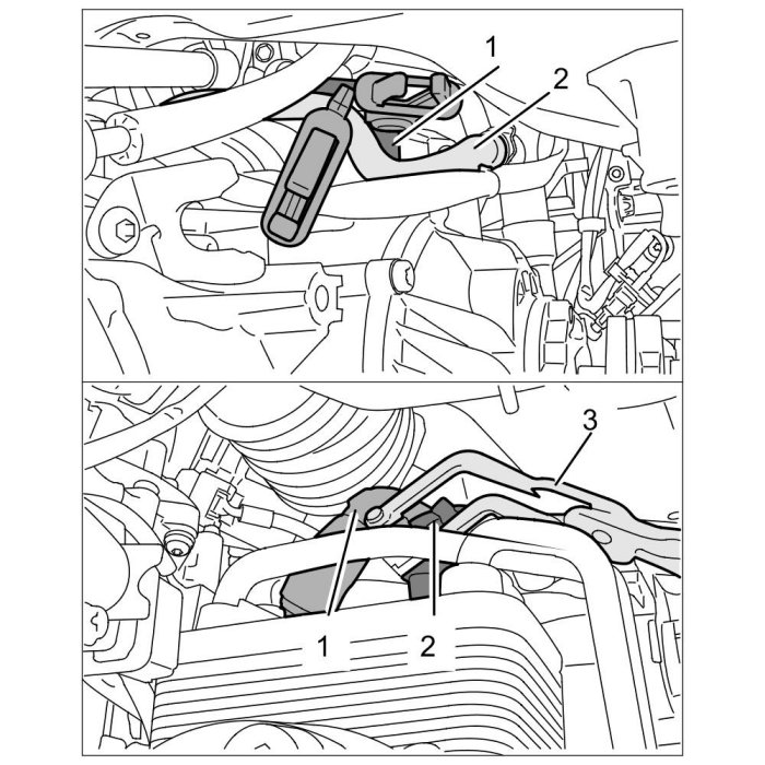 4.1. Connect coolant hoses -1- by releasing the spring band clamps -2- using a pair of angled spring band pliers -3- and securing them on the coolant hoses -1-.