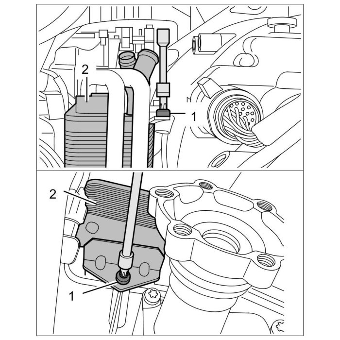 8.1. Unscrew screws -1- and remove ATF cooler -2- and ATF lines.