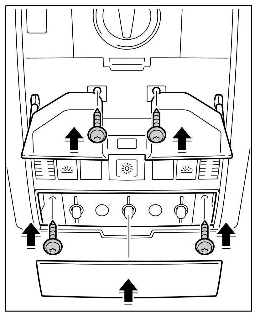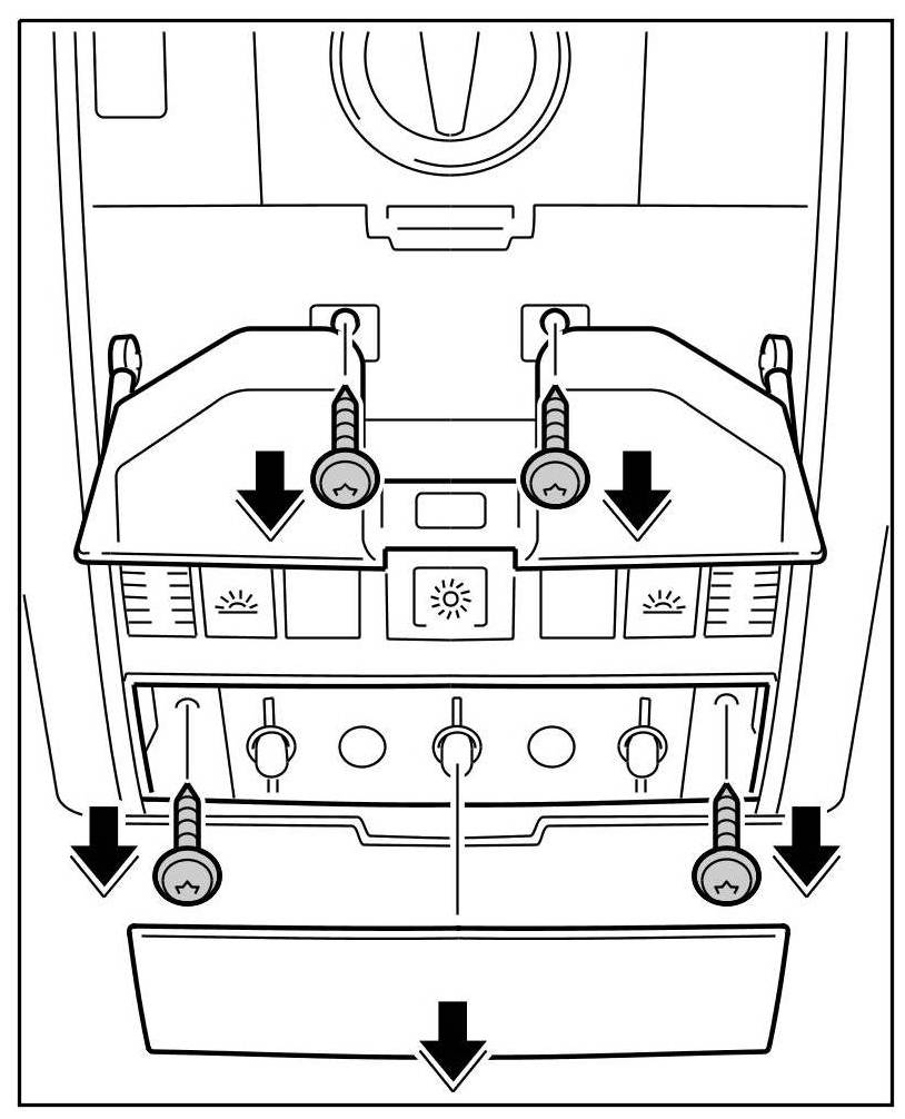 3. Fold up roof console, clip it in the roof liner and screw down using the four fastening screws. Close the glasses compartment and clip in the light unit cover.