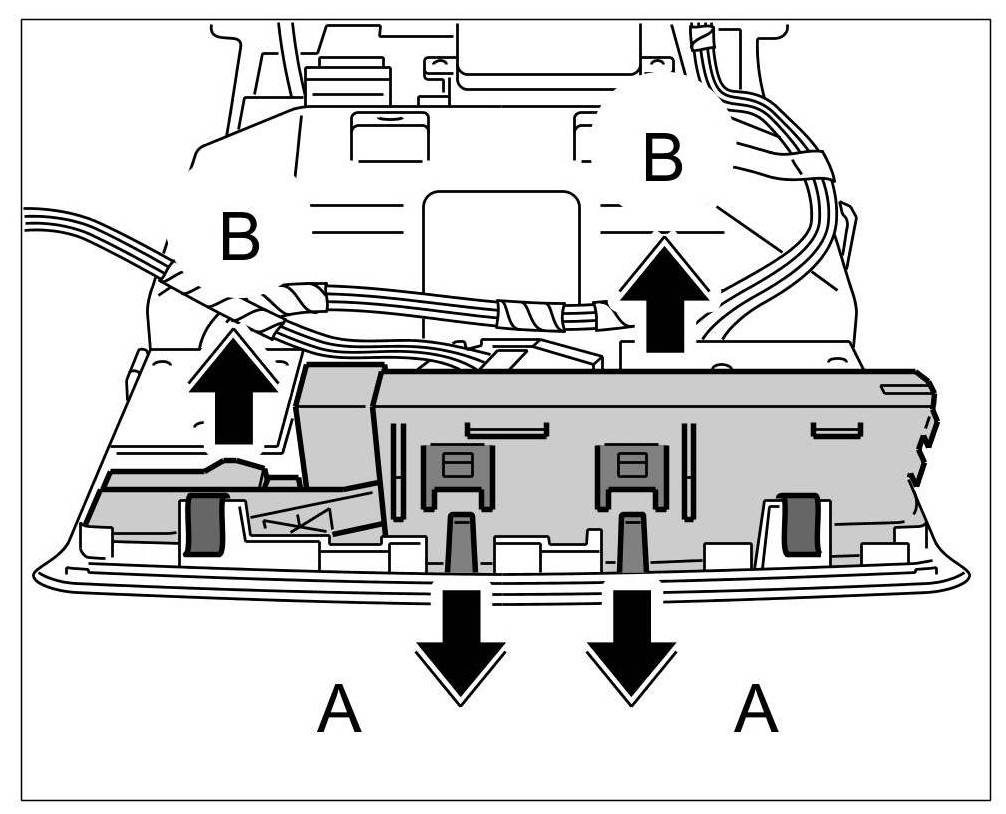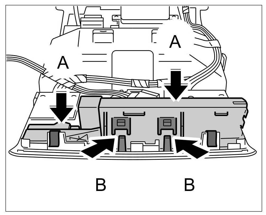 1. Insert sensor into roof console frame -arrows A- until the locking lugs -arrows B- are felt to engage. Ensure it is seated properly.