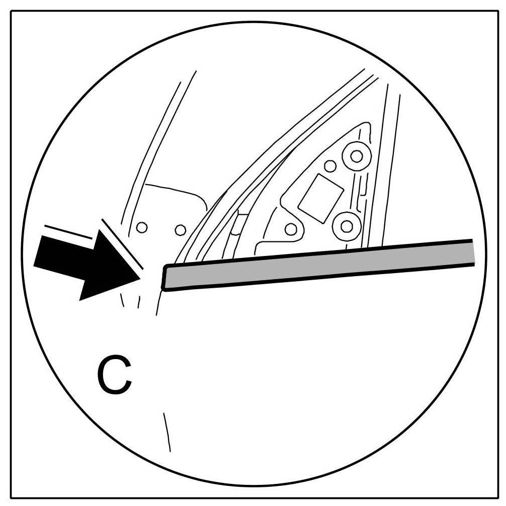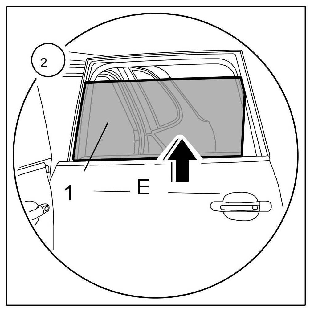 2.1. Close rear door window -1- completely ( -Arrow E- ).