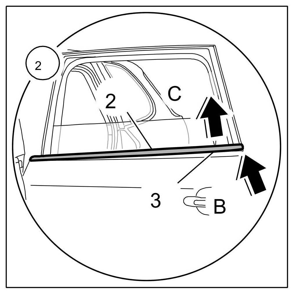 2.1. Release rear window shaft seal -2- beginning at the rear end ( -Arrow B- ) with a plastic wedge and pull it off from the sheetmetal flange -3- in an upward direction ( -Arrow C- ).