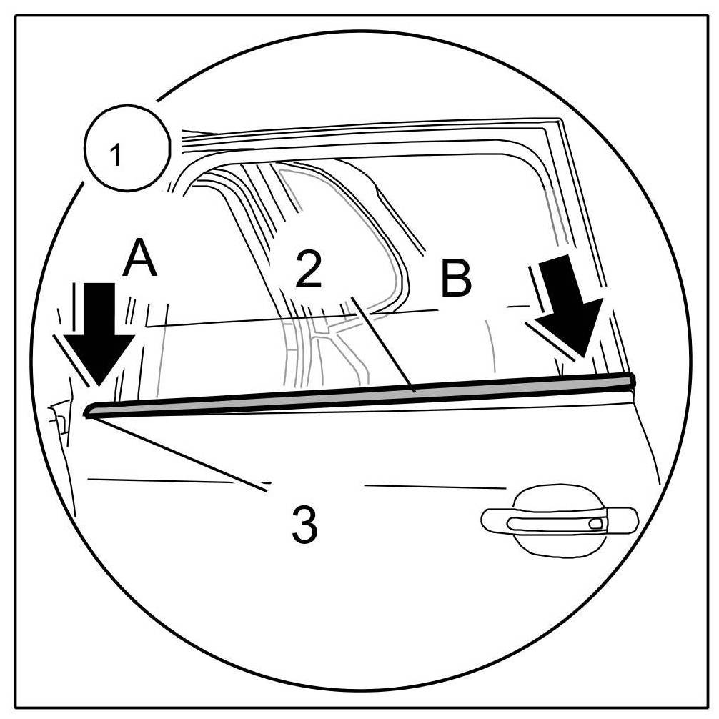 1.1. Push rear window channel seal -2- , beginning at front end ( -Arrow A- ), onto the sheetmetal flange -3- from above ( -Arrow B- ).