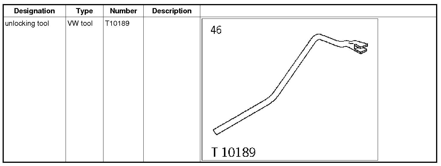 - Position the unlocking tool T10189 so that it is located in the right mould of the support and is perpendicular to the vehicle floor. Like this, the force deflection point (bending in the unlocking tool T10189) is precisely next to the screw head -arrow-.