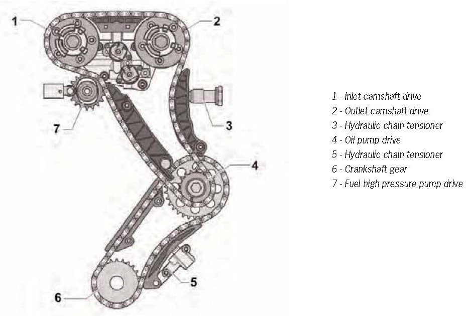 The chain drive is on the power output side of the engine. It consists of the primary roller-type chain and the camshaft roller-type chain. The primary roller-type chain is driven by the crankshaft. It drives the camshaft roller-type chain and the oil pump via a sprocket. The camshaft roller-type chain drives the two camshafts and the fuel high-pressure pump. The hydraulic chain tensioner guarantees the exact tensioning of the cam drive chain.