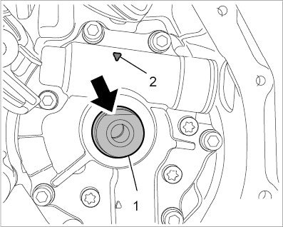 1.3. Position the oil pump shaft -1- with the flat side up so that it is horizontal to the marking -2-