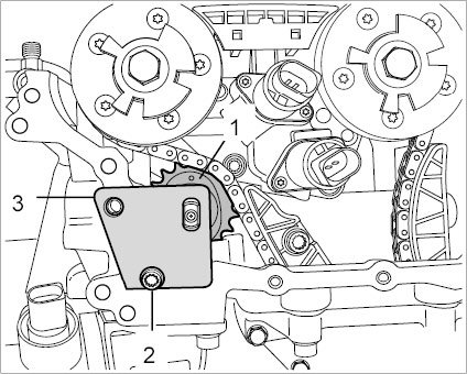 4.1. Remove chain tensioner and tensioning rail -15- To do this, unscrew both fastening screws -2-.
